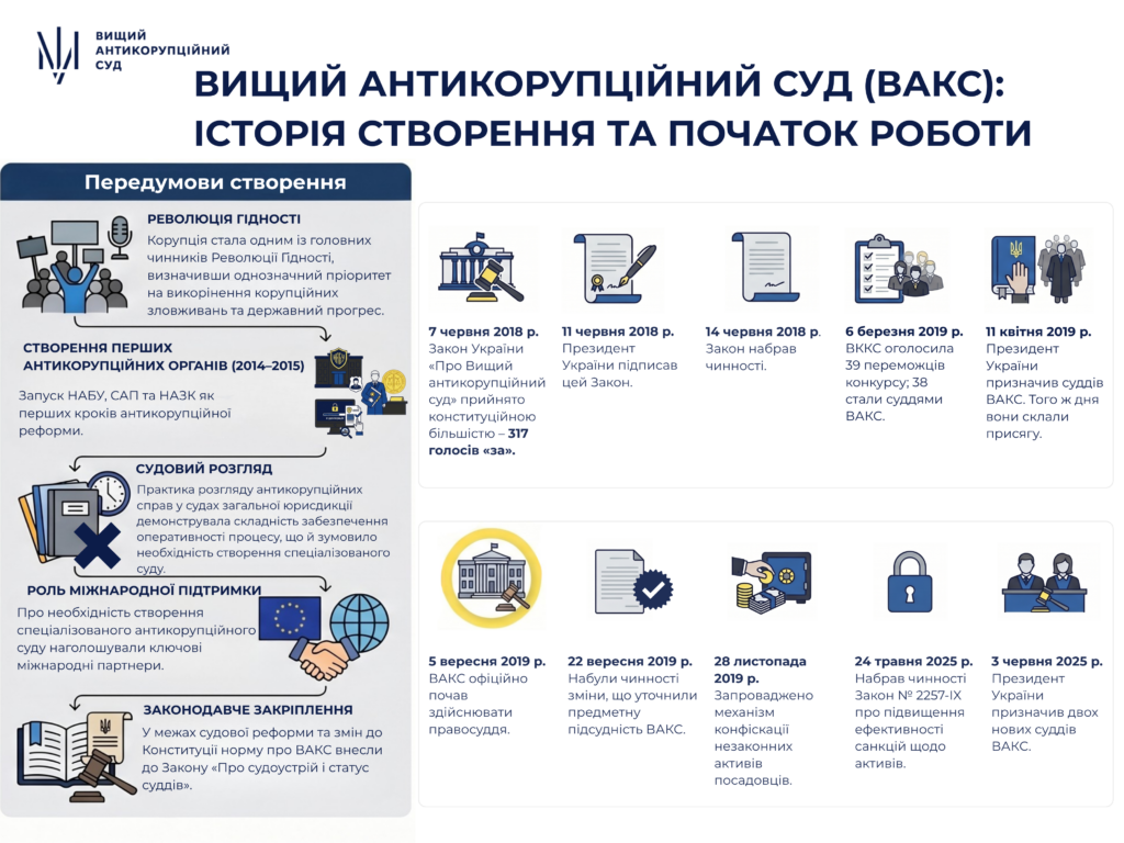 Старт формування Вищого антикорупційного суду став можливим у 2016 році в межах судової реформи. Після внесення змін до Конституції України норму про функціонування ВАКС закріпили в оновленому Законі «Про судоустрій і статус суддів».