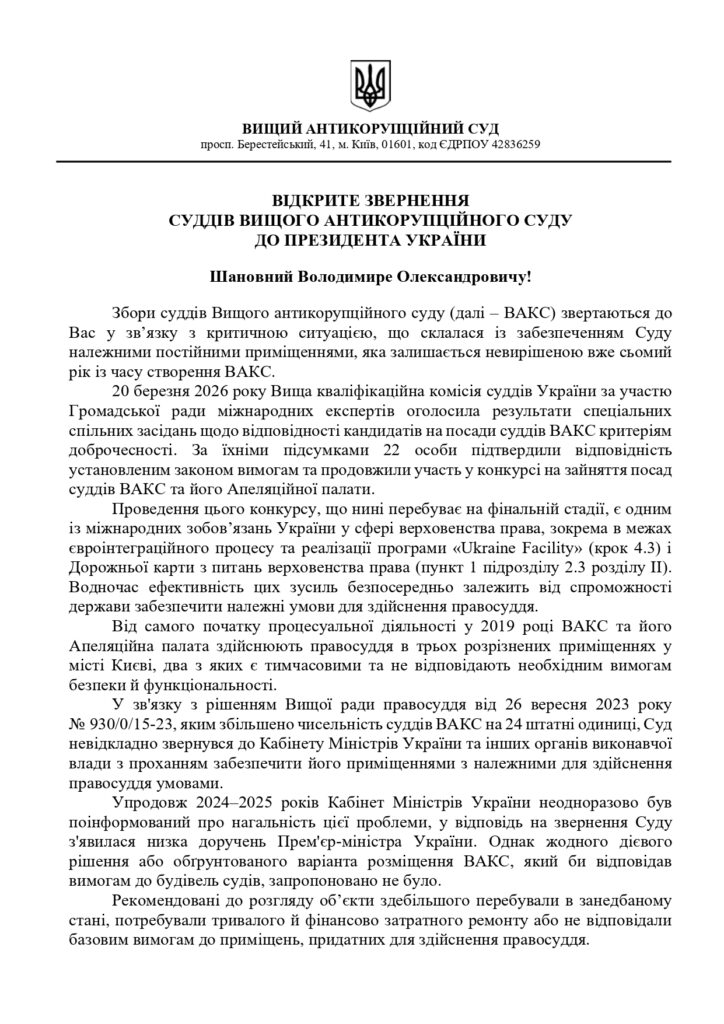 Забезпечення правосуддя під загрозою: судді ВАКС звернулися до Президента України із проханням виконати євроінтеграційні зобов’язання щодо надання належного приміщення для здійснення судочинства